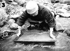 1.樋にむしろを敷き、流れの中につけて、上流から川底の砂を流す。
